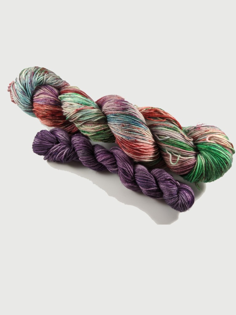 Last Christmas: A unique Christmas colorway featuring reds, greens, pinks, blues and purples. Last Christmas is available as an individual skein (custom size skein and quantity), as a set with a contrasting purple skein or as a 5 skein mini set (any size skeins).