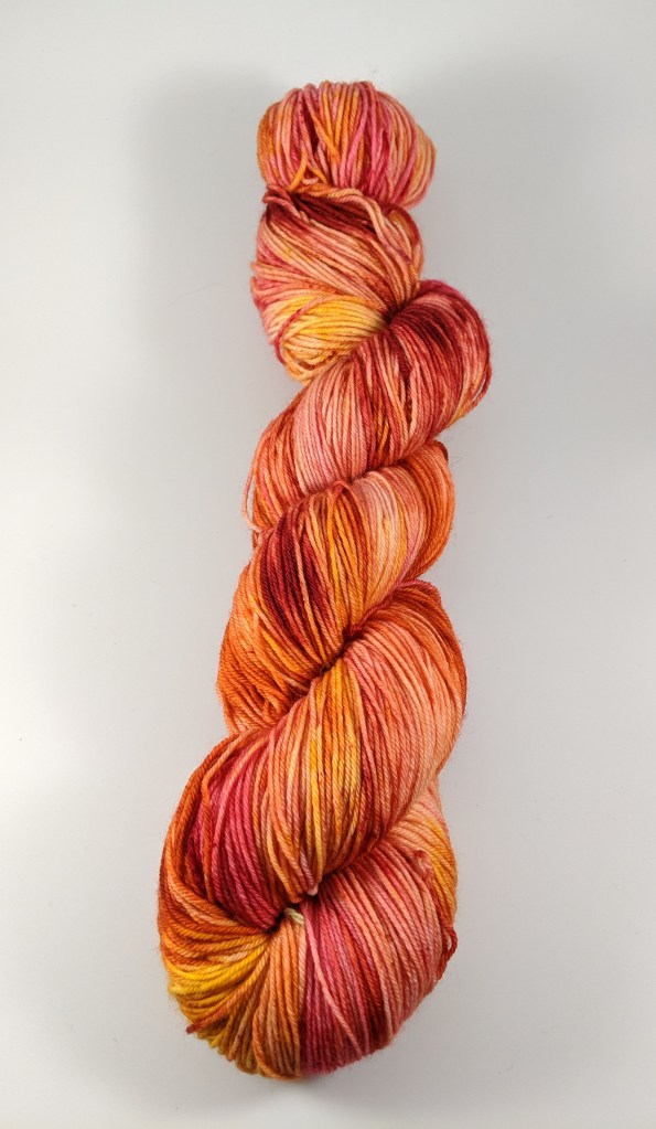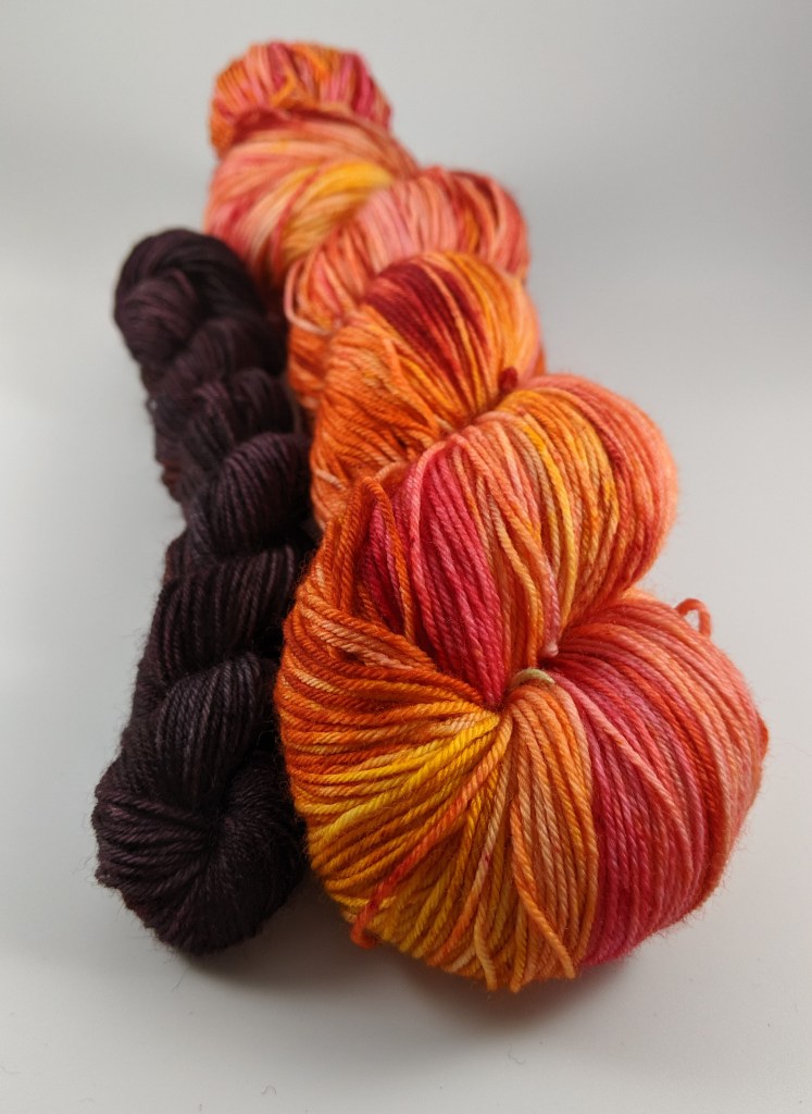 Girl on Fire: A fire filled colorway featuring red, orange, yellow and pink. Girl on Fire is available as an individual skein (custom size skein and quantity), in a set with its unique black/red contrast skein or as a 5 skein mini set (any size skeins).