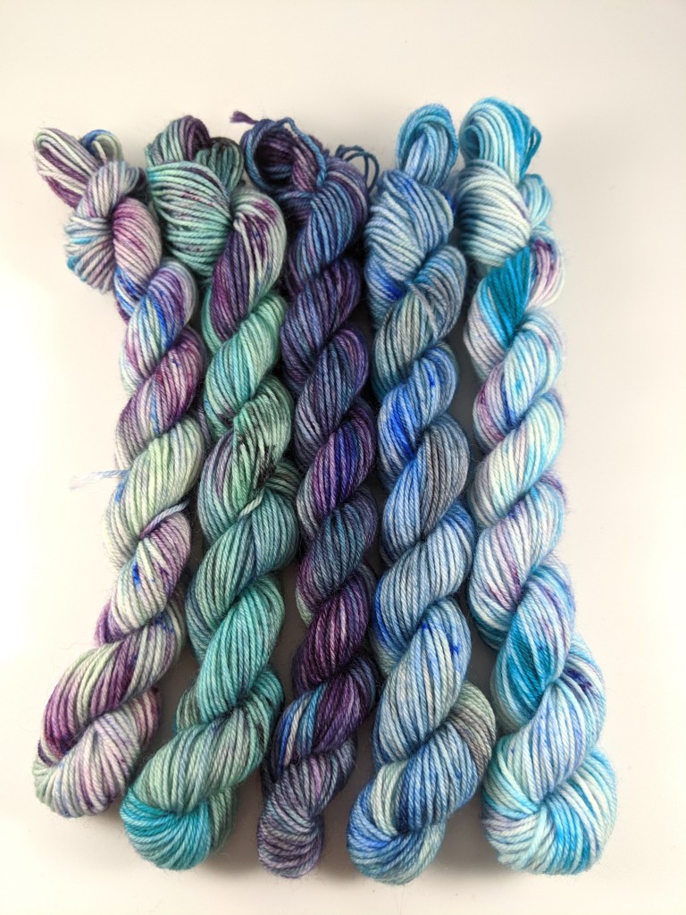 Frozen: A beautiful wintery colorway featuring blues, teals and purples. It pairs well with Blue Tundra. Frozen is available as an individual skein (custom size skein and quantity), in a set with Blue Tundra and as a 5 skein mini set (any size skeins).