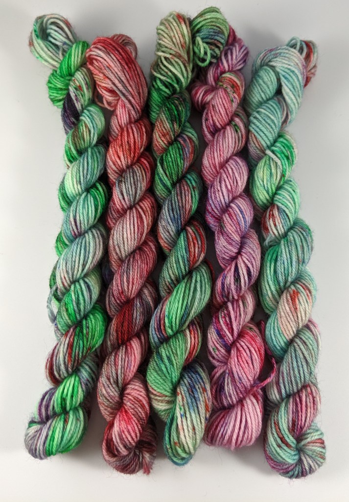 - 10g mini skein sets on Sock (50g total; 5 10g skeins): Last Christmas, Frozen, Girl on Fire