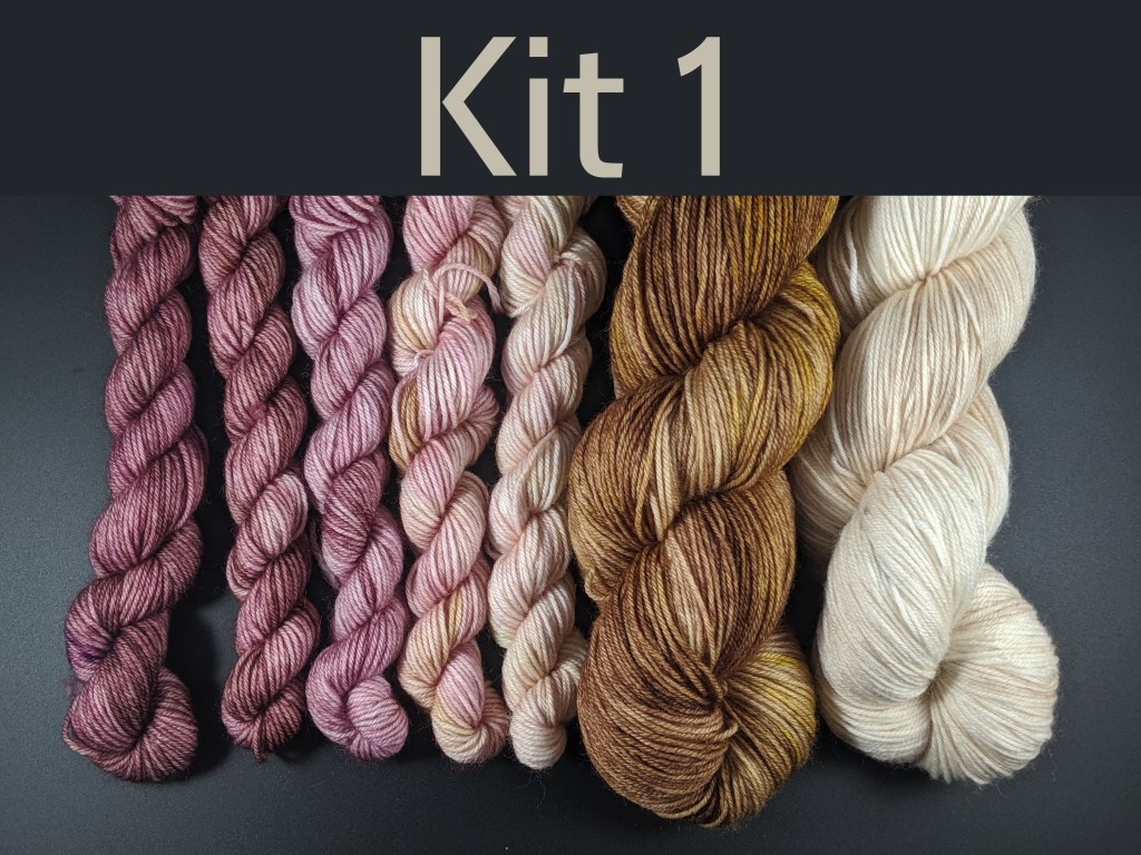 - Kit 2 uses the Gold portion of the gradient along with the deepest Rose (named “Pinot Knit-oir”) and Overnight Oats