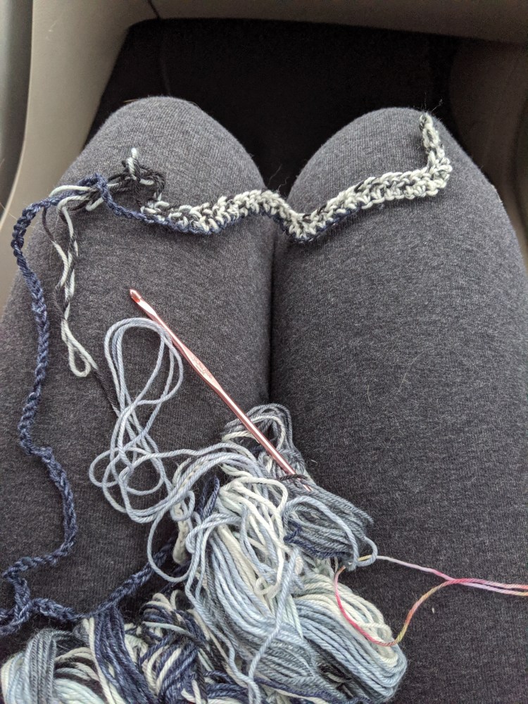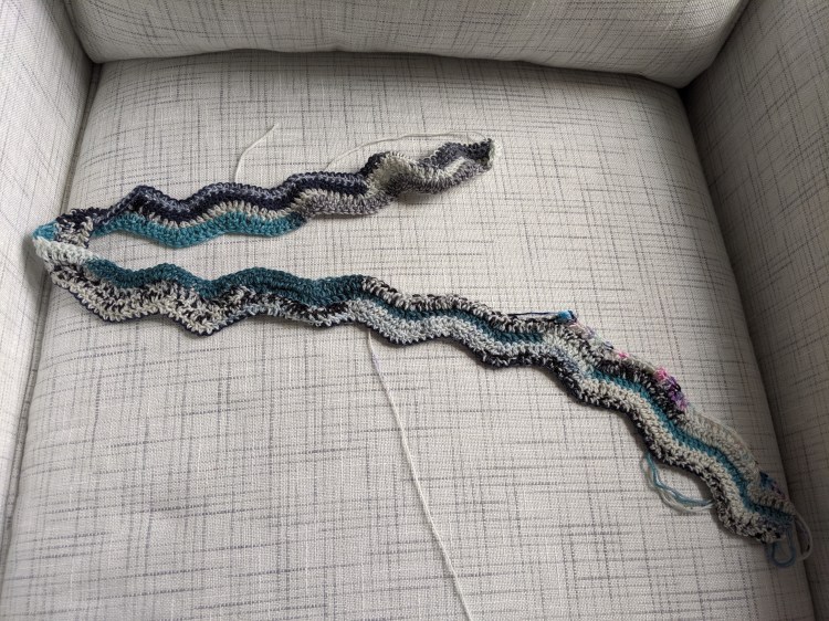 I’ve decided that for now, I’m just going to use the same color for 2 rows (there and back) and then move on even if I have enough yarn left to keep going. For a lot of these leftovers, I have about 1/2 skein left and I don’t necessarily want to use that much of each color. I figure I can always reuse the same color later on if I want to. What I’m thinking of doing is that after I crochet the two rows, I’ll find another project for the leftovers and make some charity items with it.