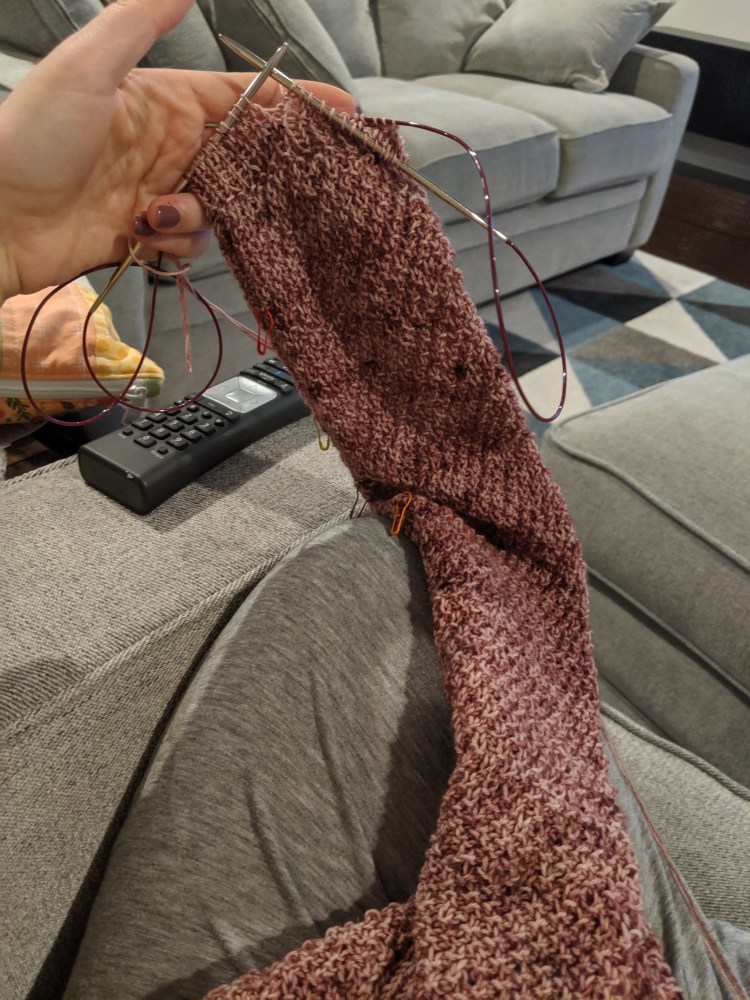 In the end, I’m finding I have less crafting time because … why? Maybe I have the same amount of time but because I’m overall less exhausted, I don’t make the time for it like I used to? I’ve been thinking about this a lot. Did I used to have more time or more need? As an introvert stuck at home, I’m emotionally more energetic, I have less headaches and that weird nausea I’d sometimes get on my way home from work. Maybe I’m relying on crafting less to get me through my day. When I used to go into the office, I’d take a lunch break in a quiet area of the building and knit. Now at home, I never take a knitting lunch break. I never even thought about it. I used to countdown to the minutes until I could. Now I don’t.