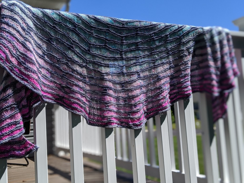 Overall, I’m happy with the results although I would change some things (smaller needles, less yarn). I would also consider knitting the rectangular Painting Bricks wrap next time instead. I think without the change in the length of rows, it’ll work better for the gradient. Go check it out!