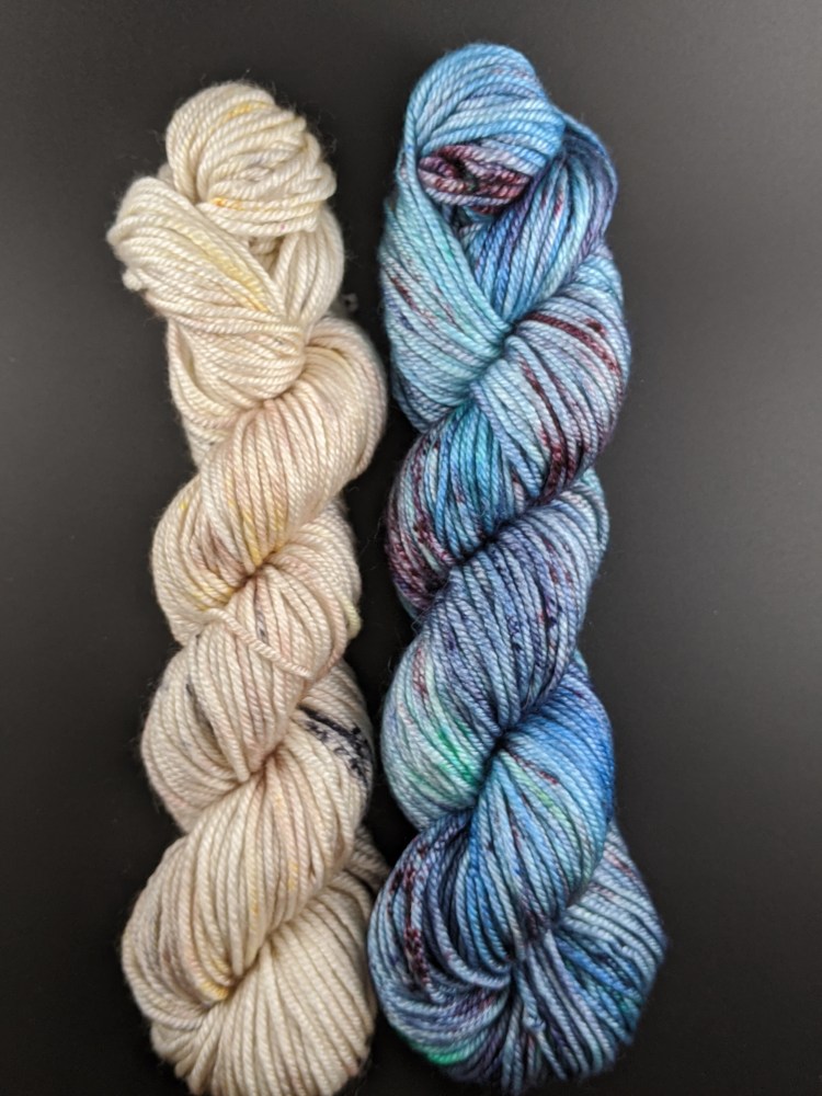 I decided on a hat because this yarn makes for really great hat yarn as it won’t be itchy on your forehead. For that reason, if you want to knit a cowl, definitely check it out. I decided to dye up a brand new colorway in honor of the new base and Majestic was born. Majestic is a blue-green base with various blues and a burgundy speckled on top of it. It pairs with Overnight Oats, of course.