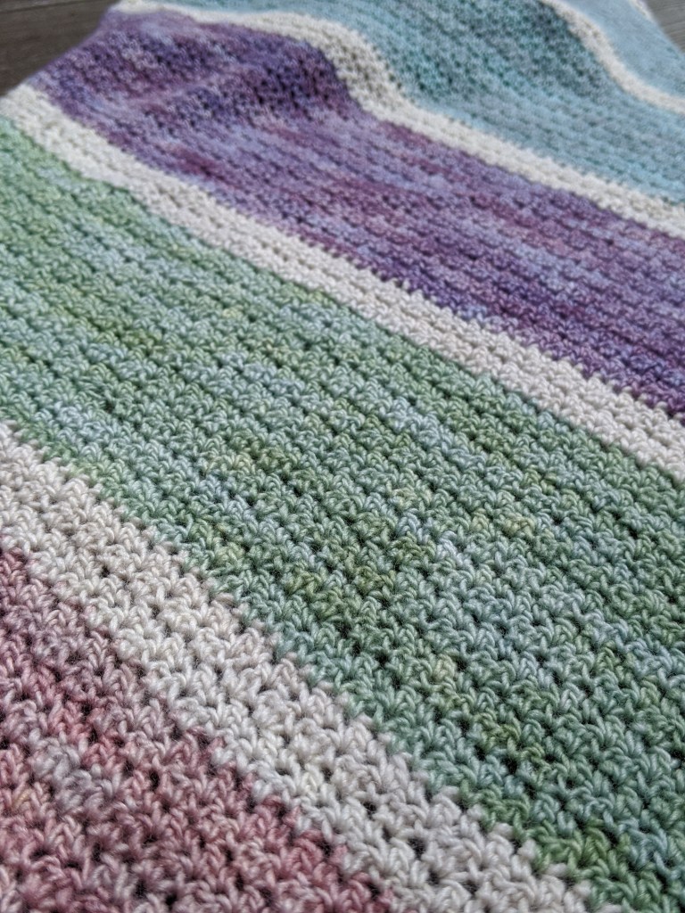 I really wanted to also show that the fade didn’t have to go from lightest to darkest. I didn’t want this kit to be a gradient and so I was happy to bring the tone back down a bit from skein #2. The fade really needed to change colors and not necessarily to change tones. You can see the purple is lighter and blends in much more. We also have lots of the neutral feel as well.