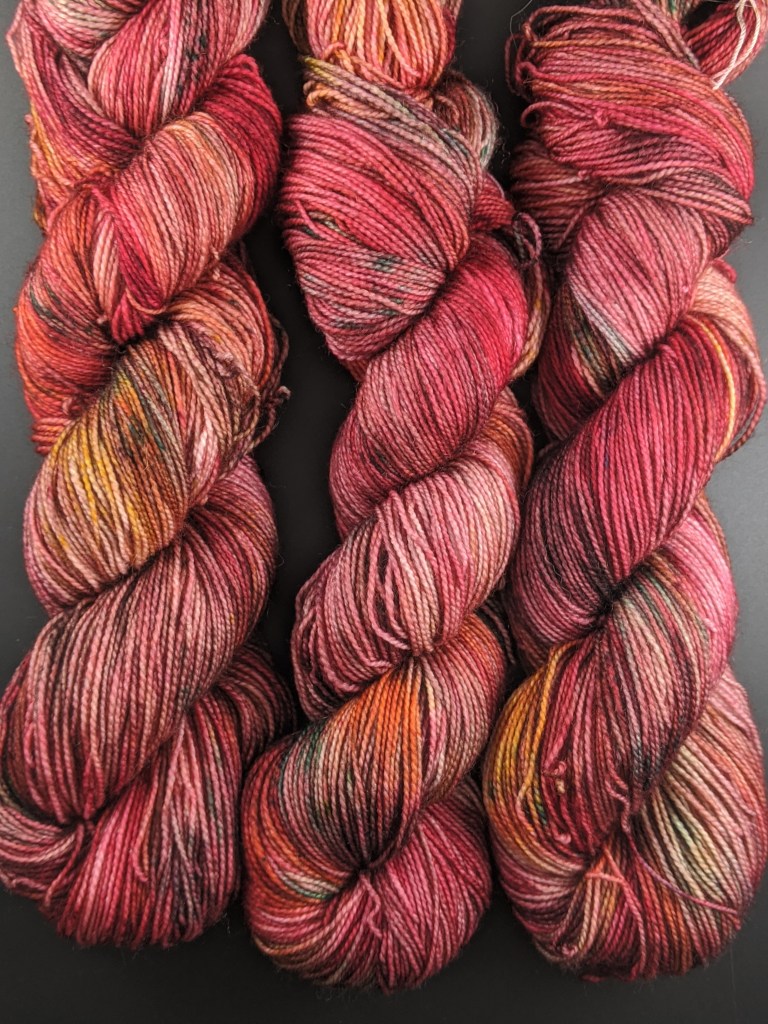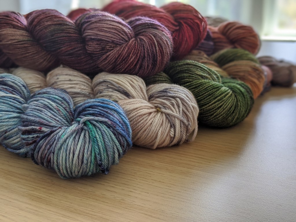 A brand new colorway that I’m already obsessed with. It’s another variegated skein, but this one has all the moods. It’s an overall purple skein with reds, blues, browns, greens and lots of autumn vibes.