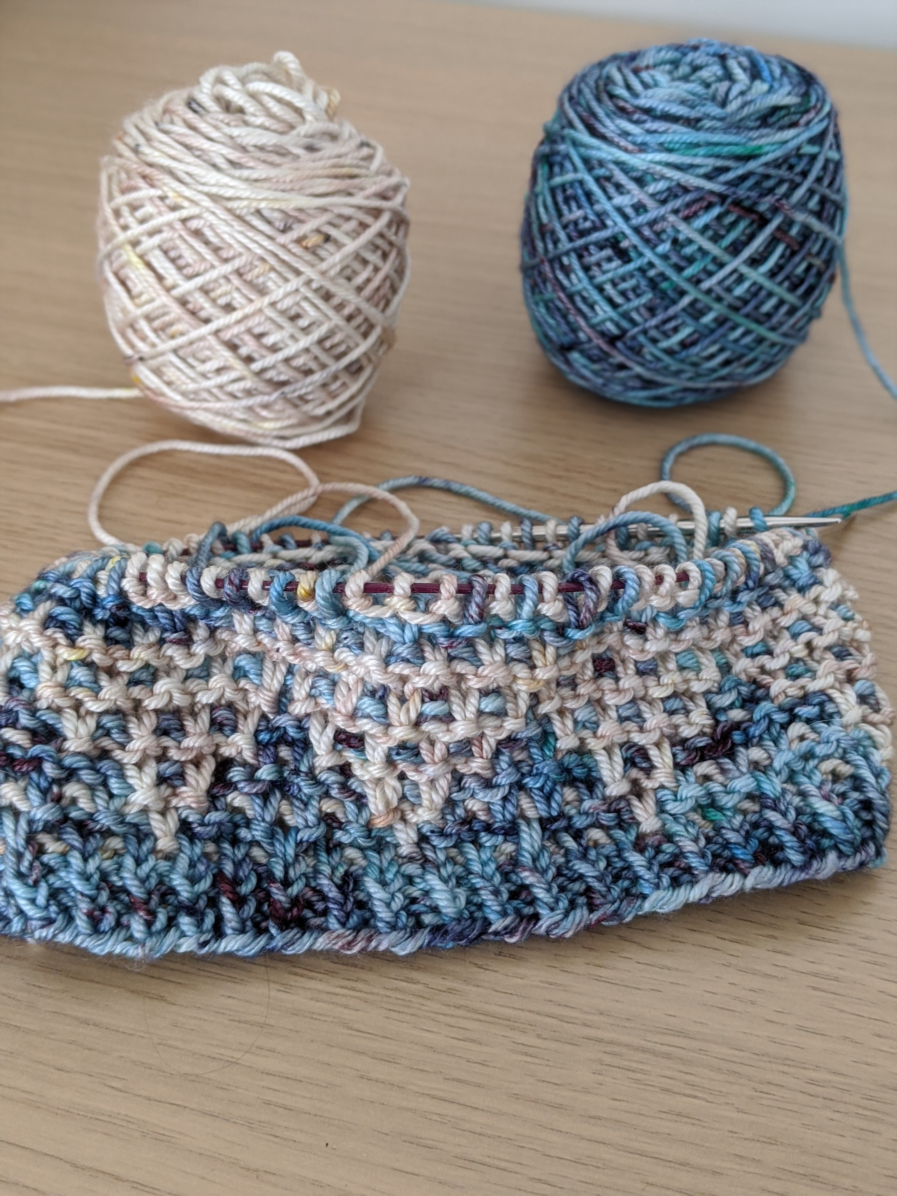 A not fall themed colorway, but I’m obsessed anyway. It’s a blue-green base with lots of blues in all shades and a deep purple/burgundy speckle. I’m using it in my Kentia Hat, but it’ll be available on multiple bases. I have a feeling this will be a hit!