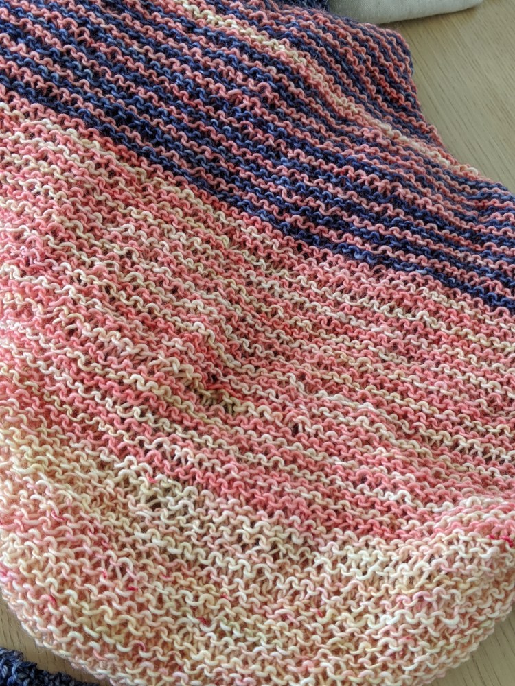 Overall, I’m happy with the results although I would change some things (smaller needles, less yarn). I would also consider knitting the rectangular Painting Bricks wrap next time instead. I think without the change in the length of rows, it’ll work better for the gradient. Go check it out!