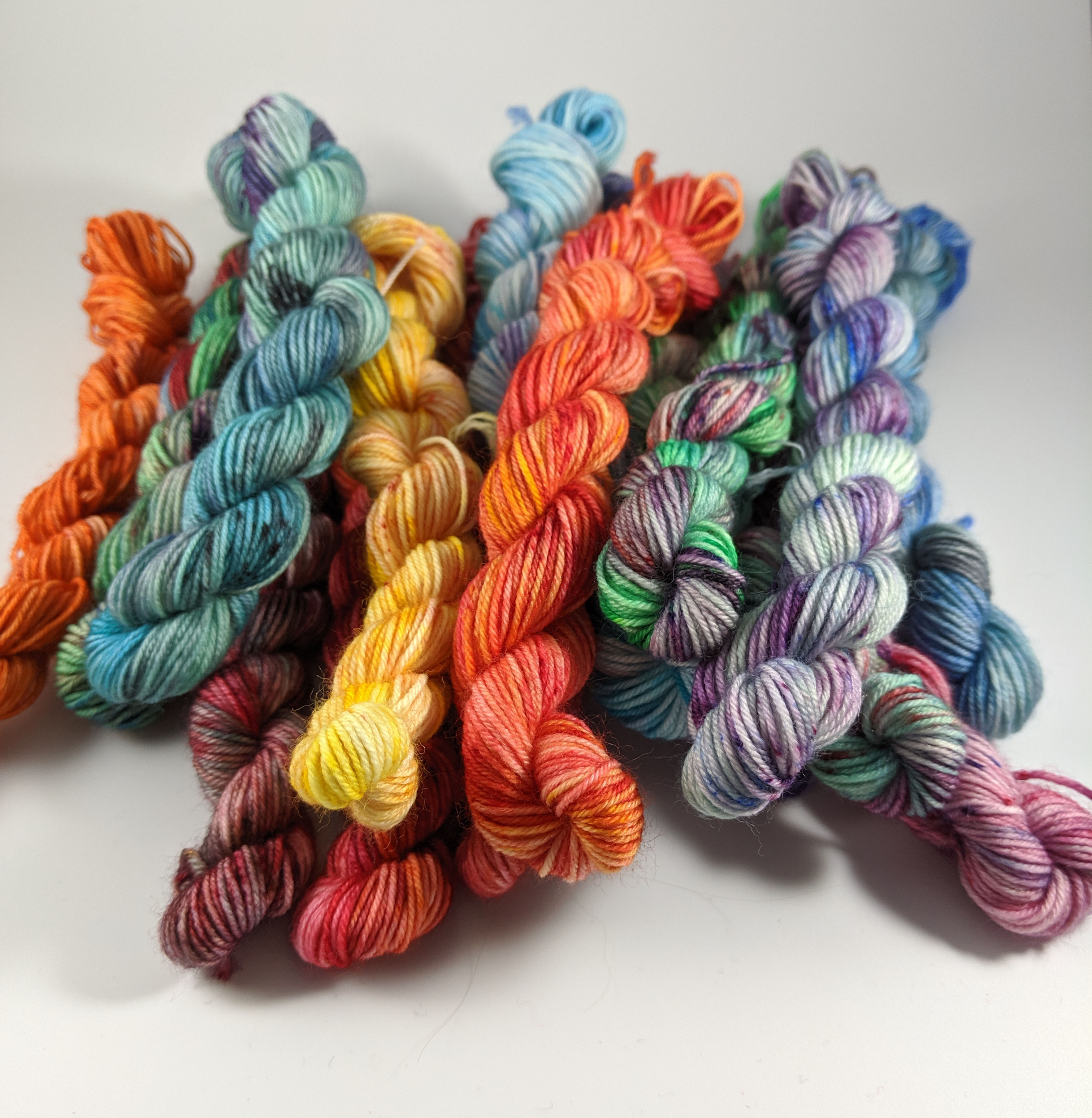 A set of mystery minis in packs of 5 minis! These are perfect to use for heels/cuffs/toes of your socks, when you need a little pop of color or for some of those scrap projects.